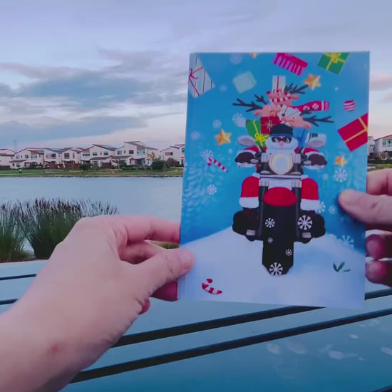 Bring joy, surprise, and holiday spirit with this Santa Claus Riding Motorcycle Pop Up Card—a thoughtful way to share love and warmth this festive season.